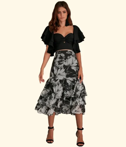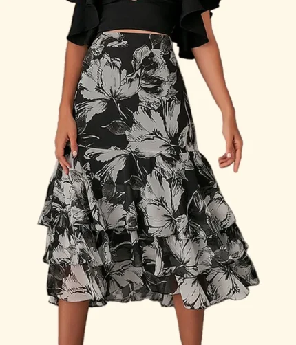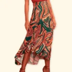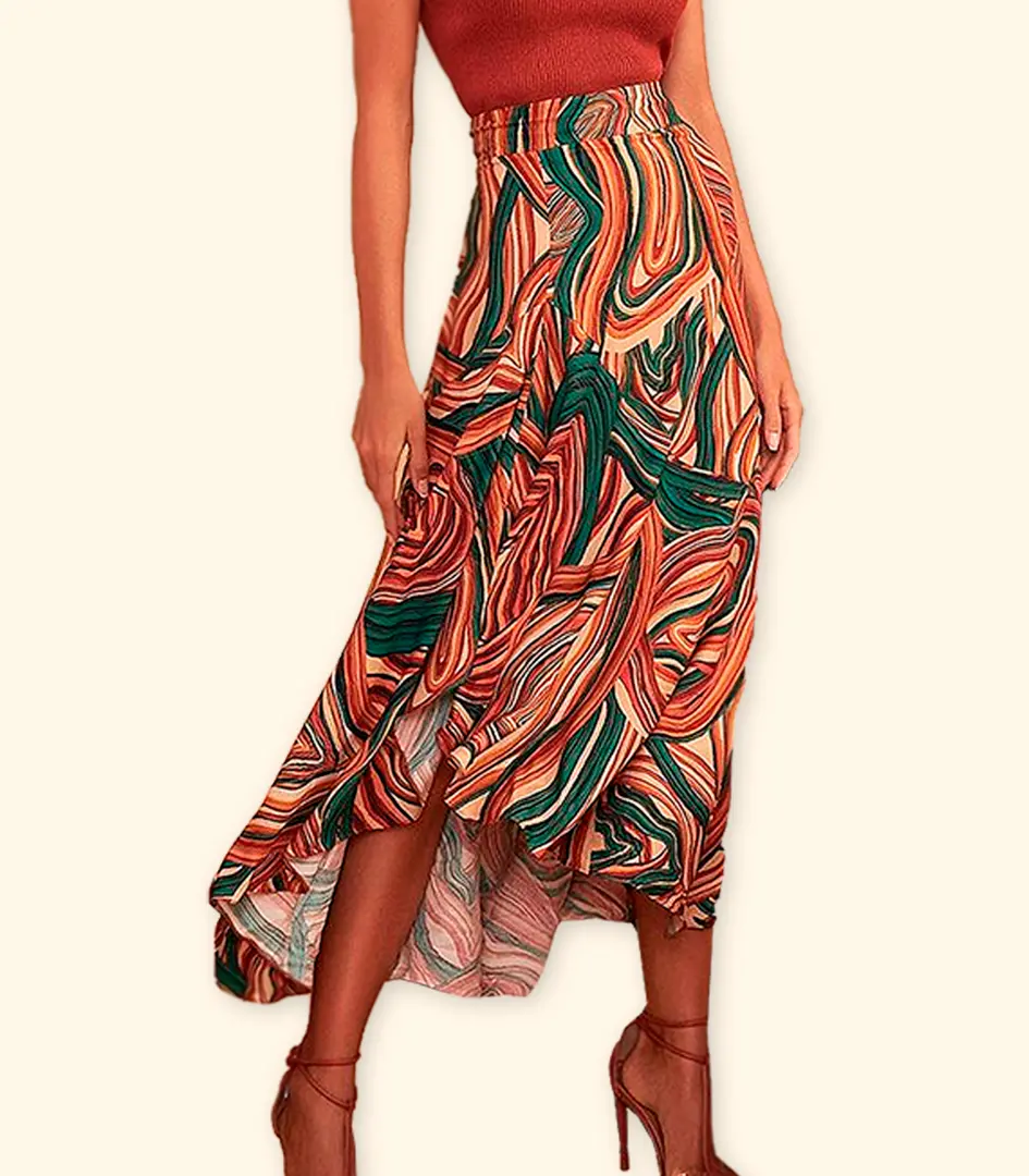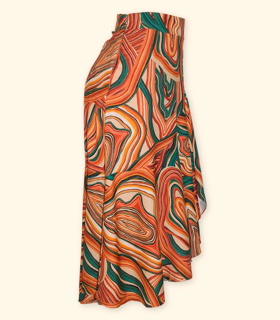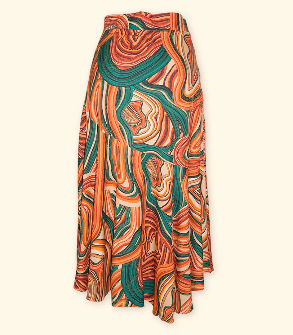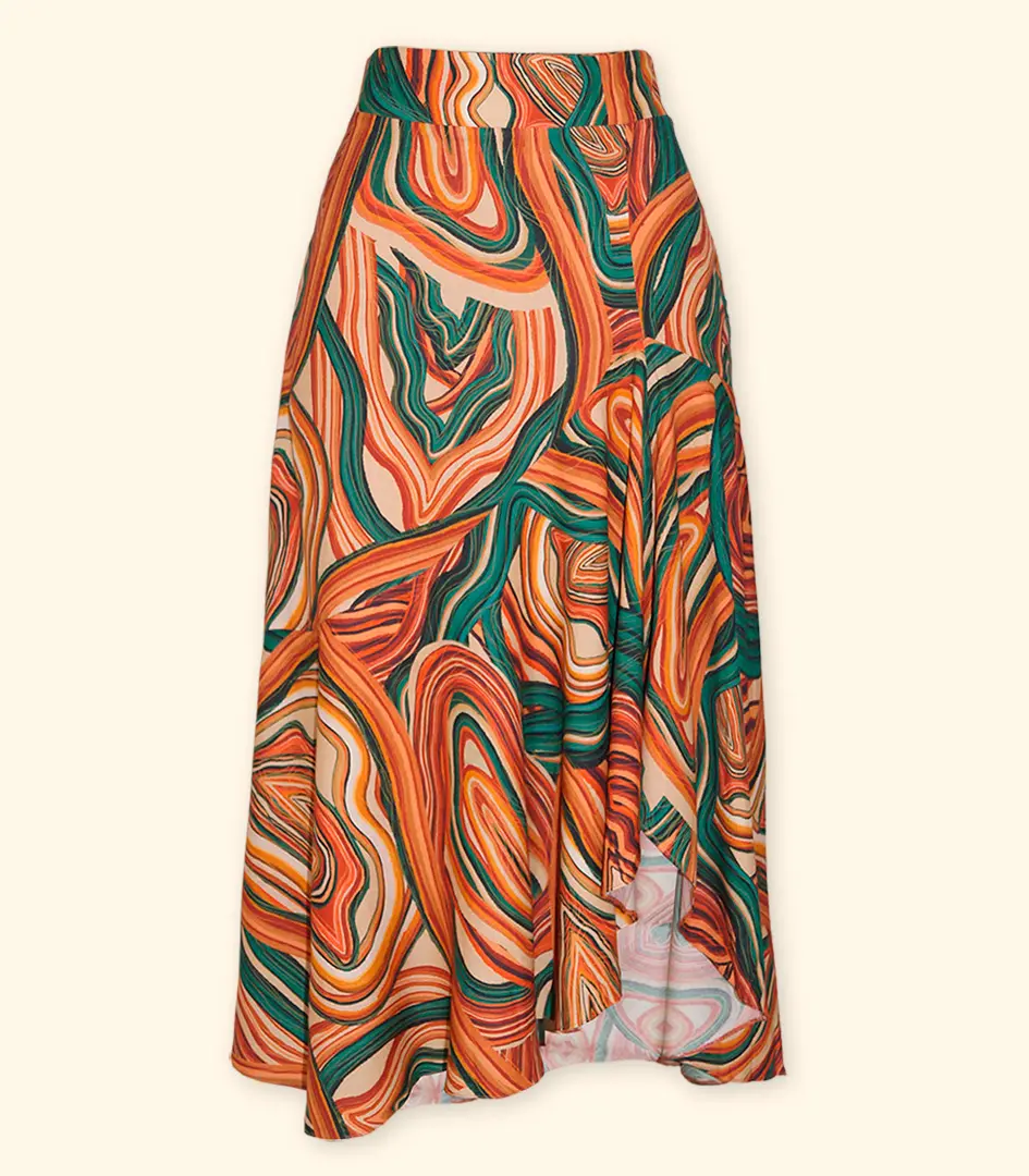 Elegante e sofisticada: As estampas exclusivas, os tecidos nobres e os detalhes refinados conferem à saia um visual elegante e sofisticado.