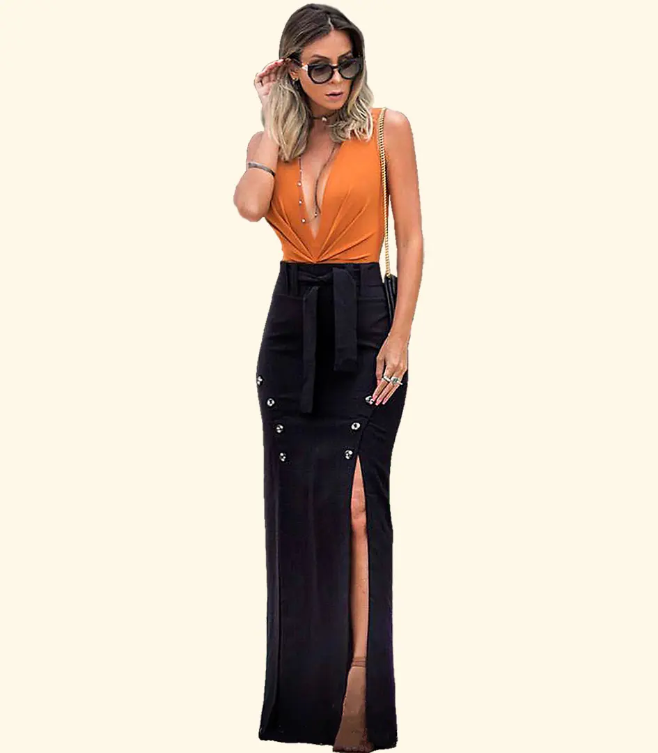 A saia longa com fenda é uma peça versátil e elegante que pode ser usada em diversas ocasiões, desde eventos formais até o dia a dia. A fenda na saia adiciona um toque sensual e moderno ao visual, enquanto o comprimento longo garante elegância e conforto.